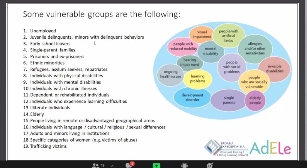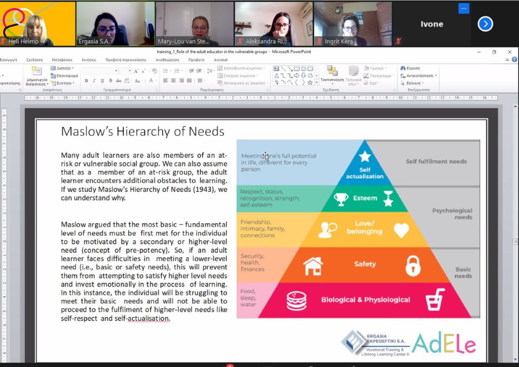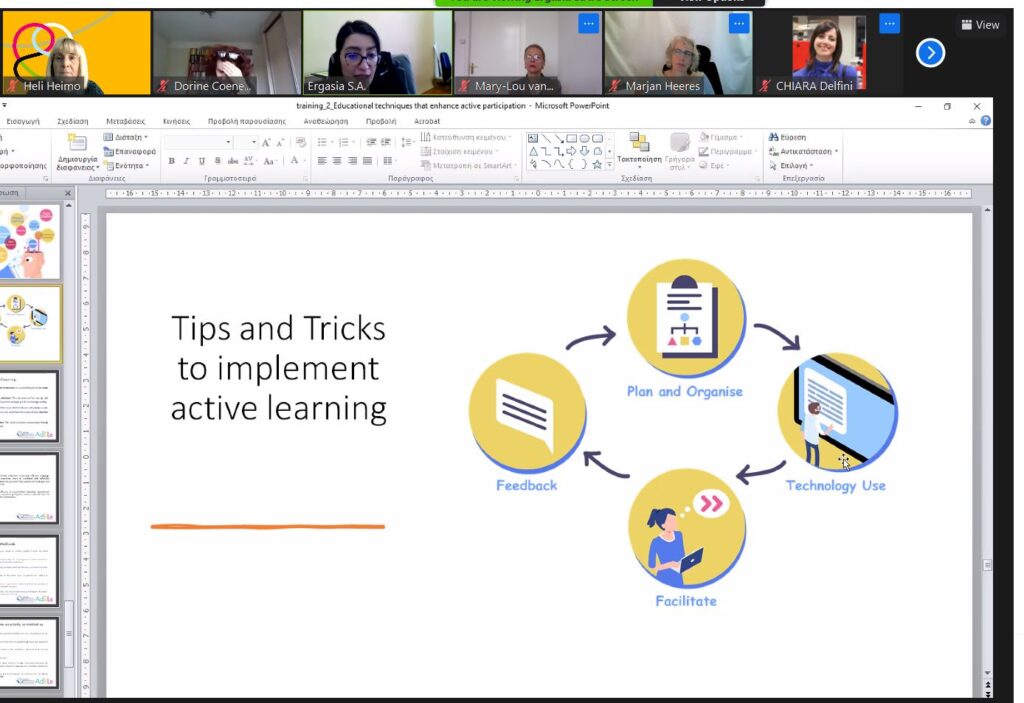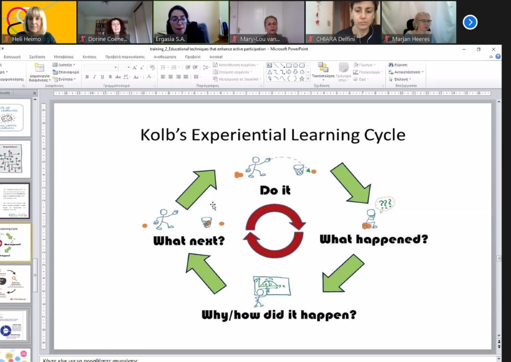 Veebikohtumised nõuavad alati hoopis teistsugust lähenemist ning seetõttu väga põhjalikku ettevalmistust. Puudub ju võimalus kõike ise tunnetada, näha ja osa saada ning kõik sõltub ka netikiirusest, osalejate keeleoskusest ja ajakavadest, mis igalühel lisaks projektitööle taustal jooksevad. Seetõttu olime kõik väga rahul kreeka partneri korraldatud seminariga täiskasvanud õppijate eripäradest ja nendega arvestamisest õppeprotsessis fookusega väheste oskuste ja madala kvalifikatsiooniga täiskasvanud õppijaile.